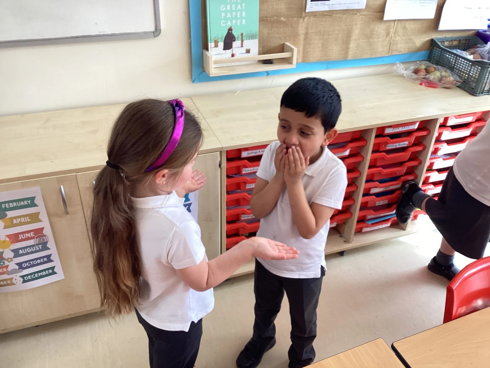 This week, we have been using Talk for Writing to help us learn and retell a story. We started by creating a story map, drawing pictures and using actions to remember each part of our The Great Paper Caper story. Then, we used our imaginations to make the story our own by changing some of the characters and objects.