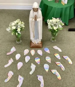 We each had a choice – some of us decorated a rose petal and wrote a prayer on it, asking Mary to help us with something special. Others chose to write a prayer on a footprint, thinking about how we can follow in Jesus’s footsteps by being kind, forgiving and loving.