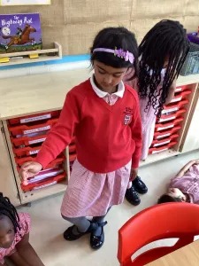 In maths, we’ve been completing our work about shapes – discussing, describing and indentifying 3D shapes in the classroom! We even had the chance to build using 3D shape, discussing their properties and if they could stack and if they had flat or curves faces.